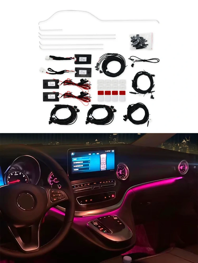 Vylepšete interiér svého vozu s 64barevným ambientním osvětlením, které poskytuje luxusní atmosféru, moderní vzhled. Tento systém je navržen pro Mercedes-Benz V-Class W447 a umožňuje synchronizaci s originálním 3barevným ambientním osvětlením vozu a rozšíří jej na 64 barev.